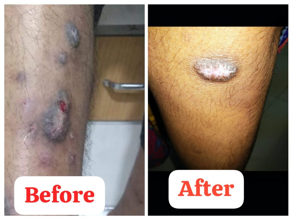 - Recent Follow up after 1year 2months: The other lesions shrinked in size , the upper shin lesion shrinked in size with ridge like presentation better by 40% , no episodic bleeding or ozzing from the lesion. Her constipation has improved and Pre- menstrual pains have reduced .