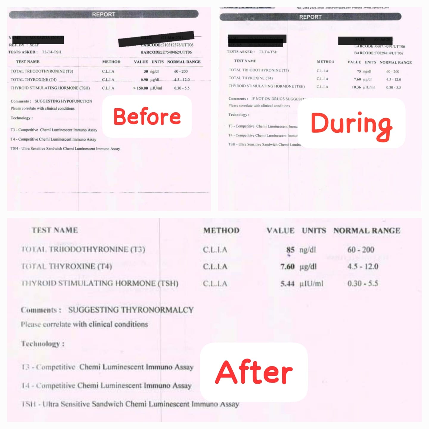 – **TSH Reduction:** The marked decrease in TSH levels from 150 µIU/mL to 5.5 µIU/mL suggests a positive response to the homeopathic treatment.